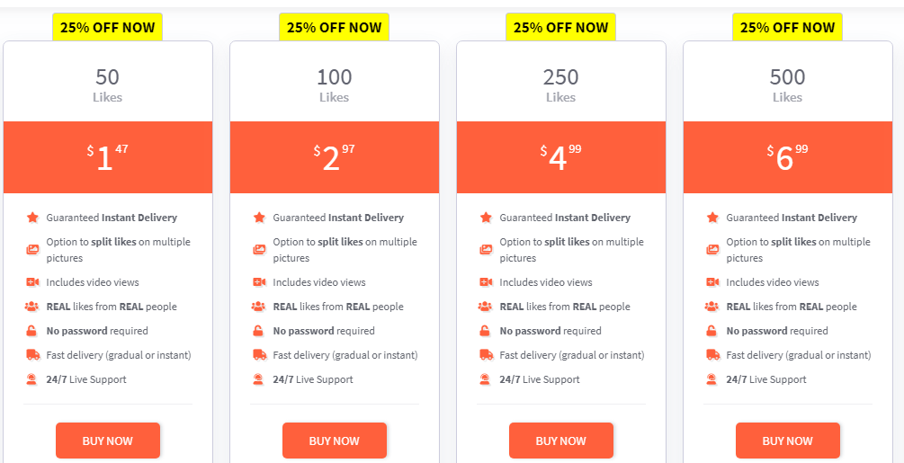 Here’s one of such examples, when services have ‘guaranteed’ quality for $1.47 per like pack, usually bought in bulk from 50 to 10,000 or more. Such services are not even banned in Google and other search engines and have positive reviews.