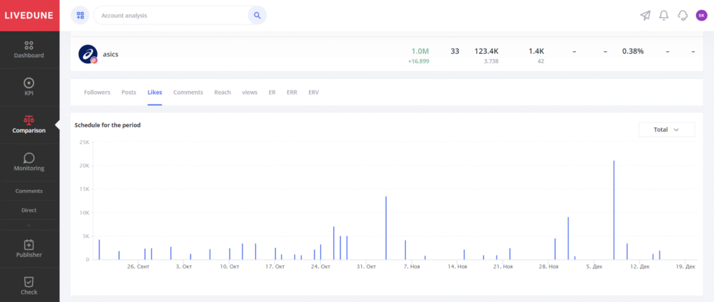 The service, as well as comparison of accounts, will calculate the total number of followers in all the brand accounts, total ER, likes, posts, etc.
