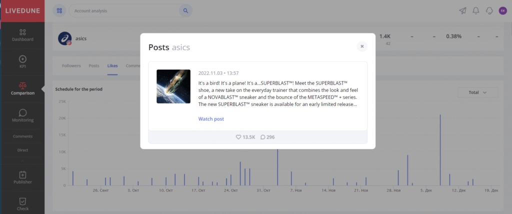 If you want to see what posts were published, for example, on November 3 (peak in the number of likes), click on the graph. The list of posts will be loaded, showing statistics for that time period.