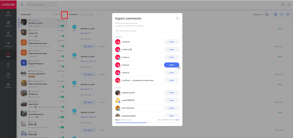To get started, register in LiveDune and add an account to the Dashboard from which you want to upload comments. Next, go to the “Inbox” module, then to “Comments”. Click “Download comments in XLS”.