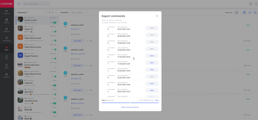 Next, click the “Select” button next to the account from which you want to download. A window with a list of posts will open. Next to the desired post, click “Select” again. If there were no comments under the post, the button will be inactive. The most recent posts are on top, if you need to export comments from older posts, click “Load more”.