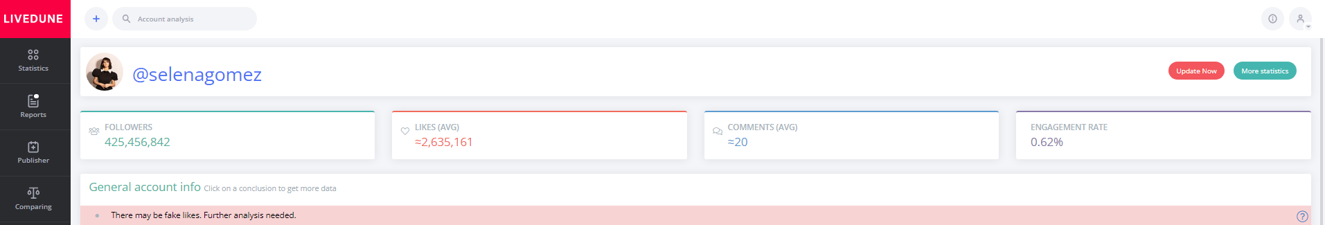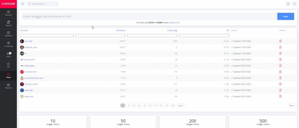 To get an answer to the question “Does an Instagram blogger inflate likes in his account or not?” You can quickly and inexpensively, by using LiveDune’s Blogger Verification tool. This tool makes use of everything we know about Instagram bloggers and how our users check them for platform manipulation.