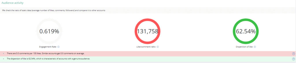 The “Audience engagement” block displays 3 circles: ER, the ratio of likes to comments, and the spread of likes on posts. If they are red, it means that the indicators in the account for these metrics are very low compared to similar accounts in terms of the number of followers. Yellow is low, but not critical. And the greens are all great.