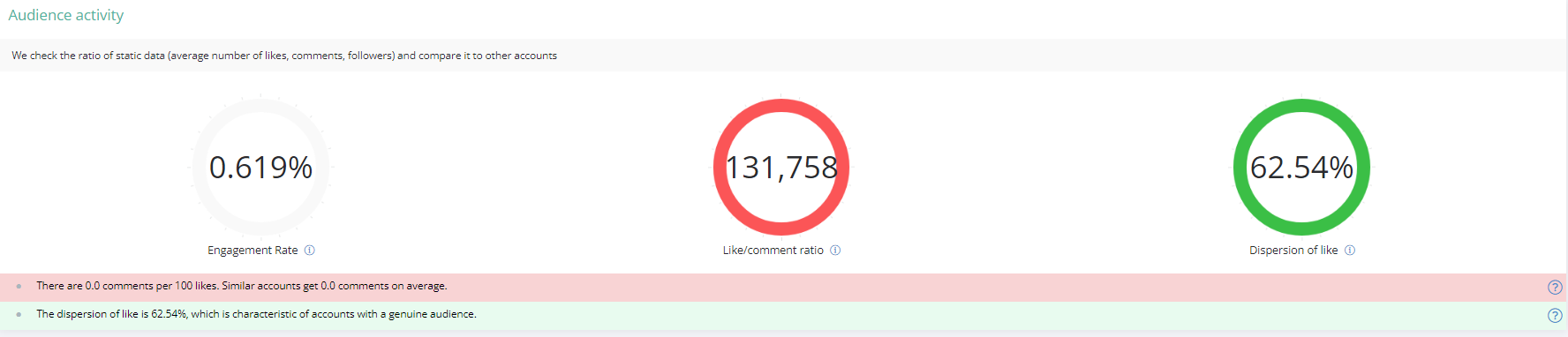 Likes/comments ratio ― the average likes per post is divided by average comments per post, and compared to accounts with a similar number of followers.