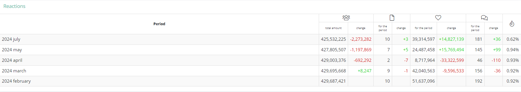 In the “Reactions” block, the account indicators for different months are compared: