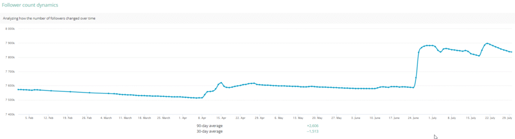 Here we see a sharp uptick in follows from 800 thousand to 845 thousand in one day followed by a slow outflow. In 99% of cases, such a surge is precisely what follower exaggeration looks like. But it’s always worth remembering that absolutely anyone can set up bots in an account, not only the account owner. Try to send this screenshot to the account owner and ask him to explain the sudden spike. Most likely, he won’t be able to.