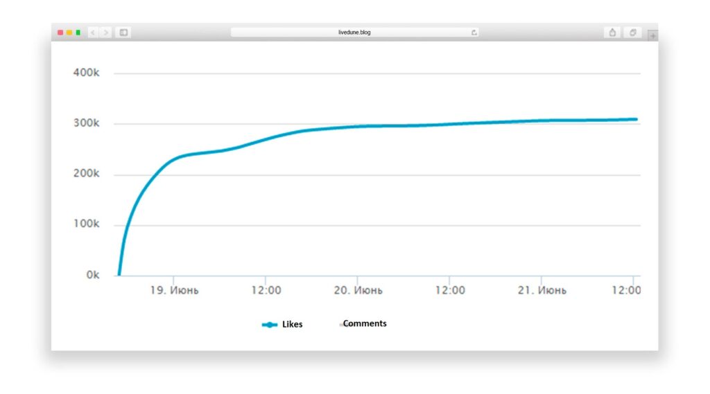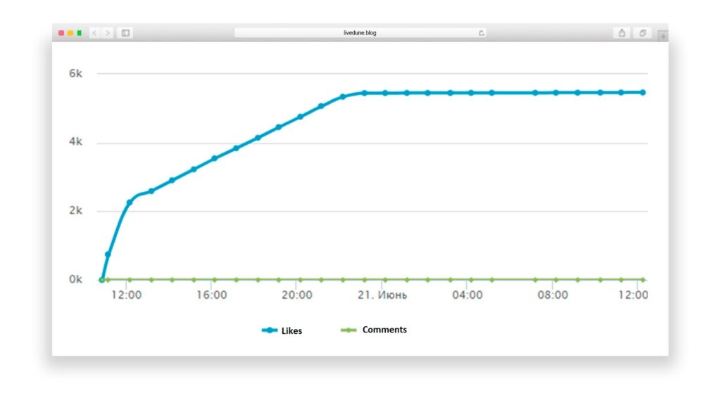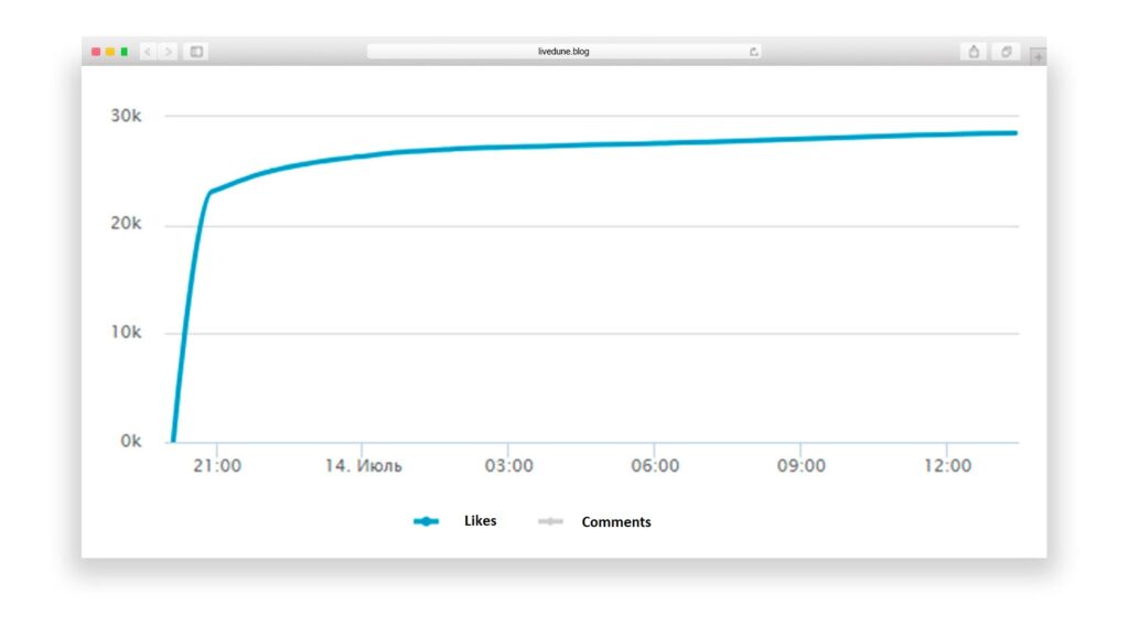 This is the dynamics of likes within 24 hours after publication. The post received 23 thousand likes in the first hour and 5 thousand in the remaining time. At first glance, there doesn’t seem to be anything to complain about. But if you compare how likes are collected on accounts with an authentic audience, everything becomes crystal clear right away.
