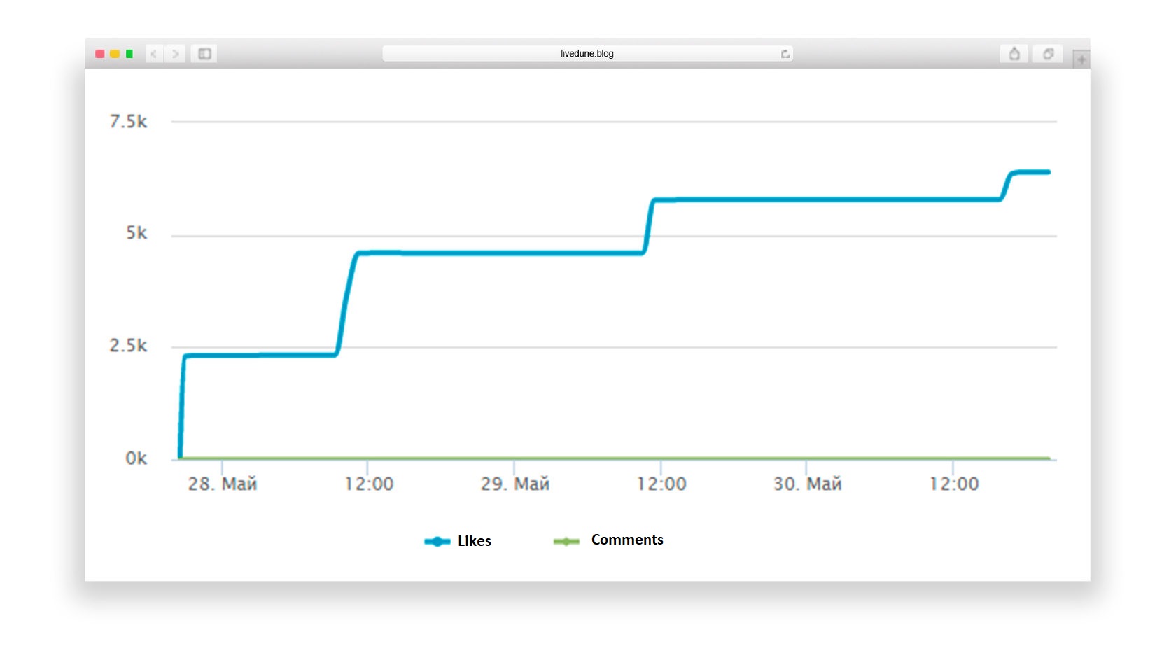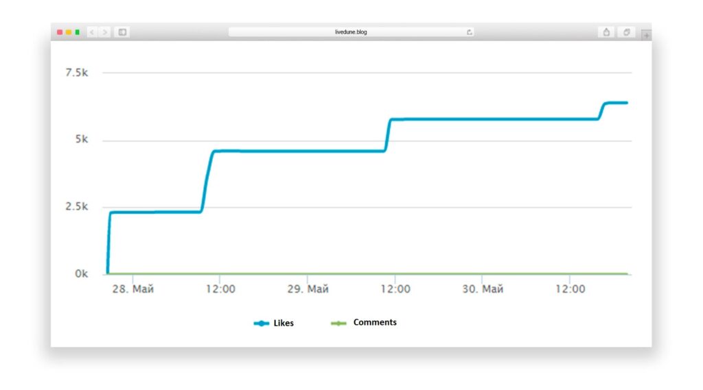 Let’s look again at the previous chart with the sharp increase in the first hour. Most importantly, we can see a sharp corner at about 21 o’clock; this is the moment when the likes stopped being bought. Compare with the second graph, the line is smooth and doesn’t have any sharp corners. Or this example: