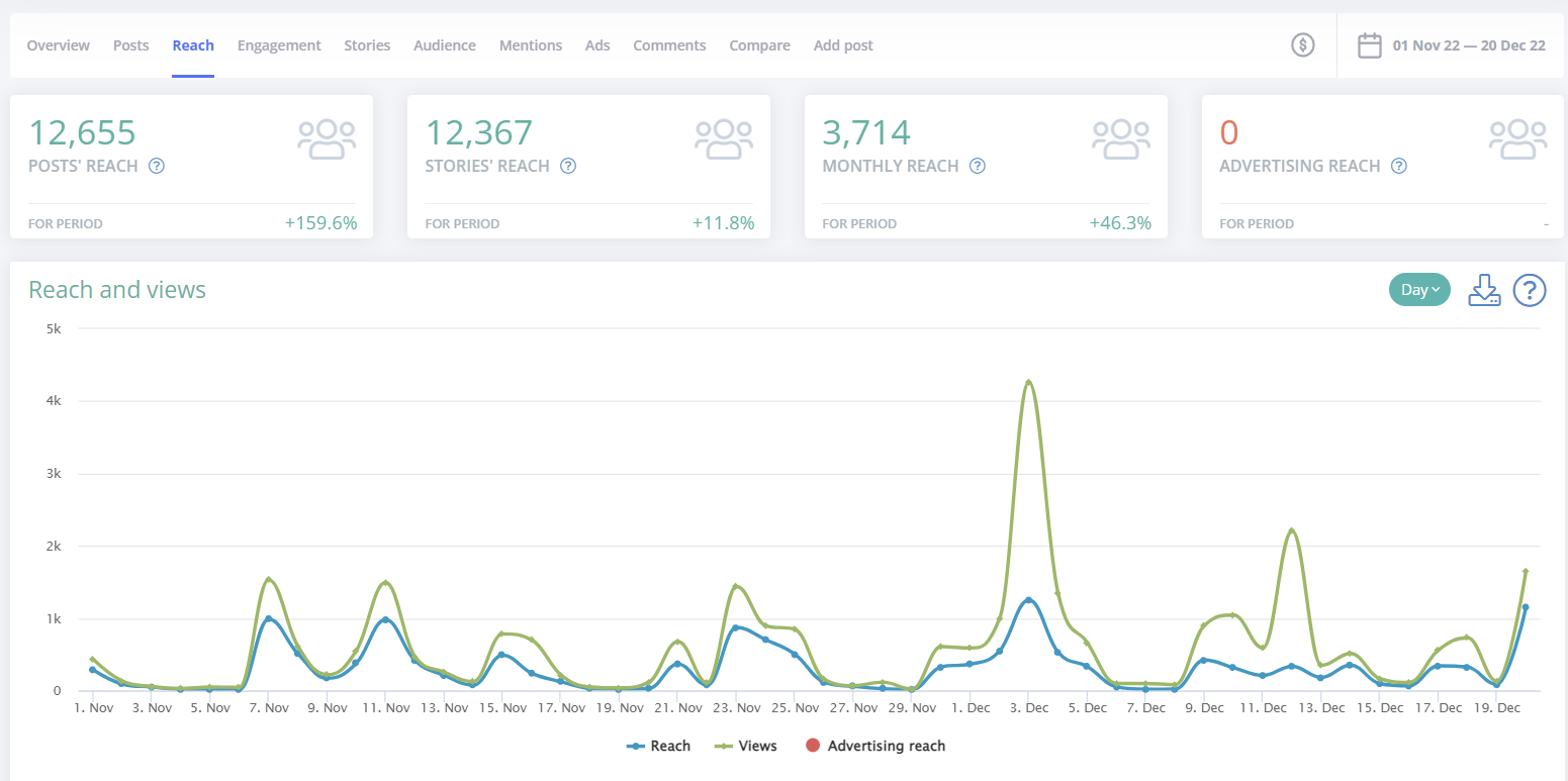 All statistics on the reach of your account are collected in LiveDune on the “reach” tab, only reach through Stories is on a separate tab.