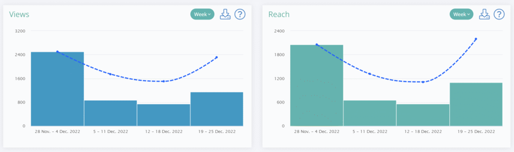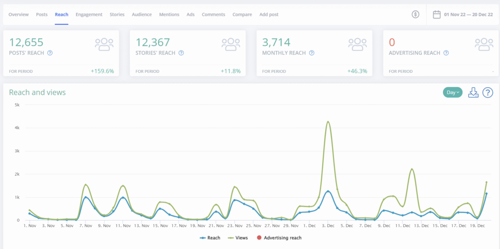 All statistics on the reach of your account are collected in LiveDune on the “reach” tab, only reach through Stories is on a separate tab.