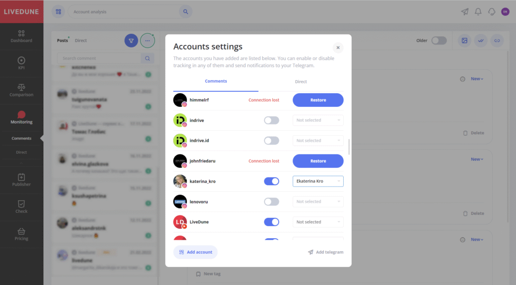 The comment tracking module saves the lives of many businesses that manage stores selling through social networks. This feature includes not just monitoring, but the ability to respond directly to Instagram or Facebook comments from LiveDune and send notifications of new comments to Telegram. The comment tracking interface looks similar to your usual messengers – WhatsApp, Telegram and others. You can see the description of the application for managing comments in the video below.