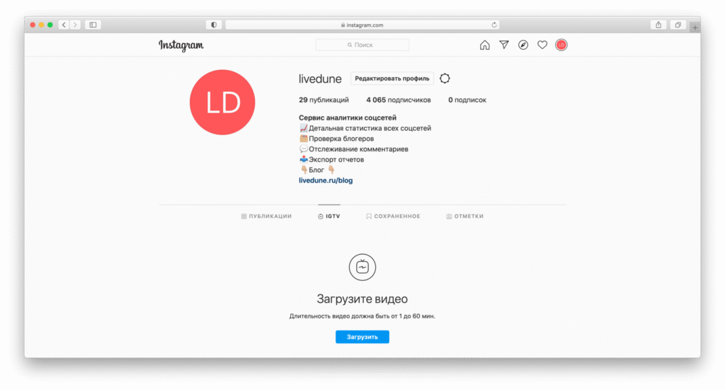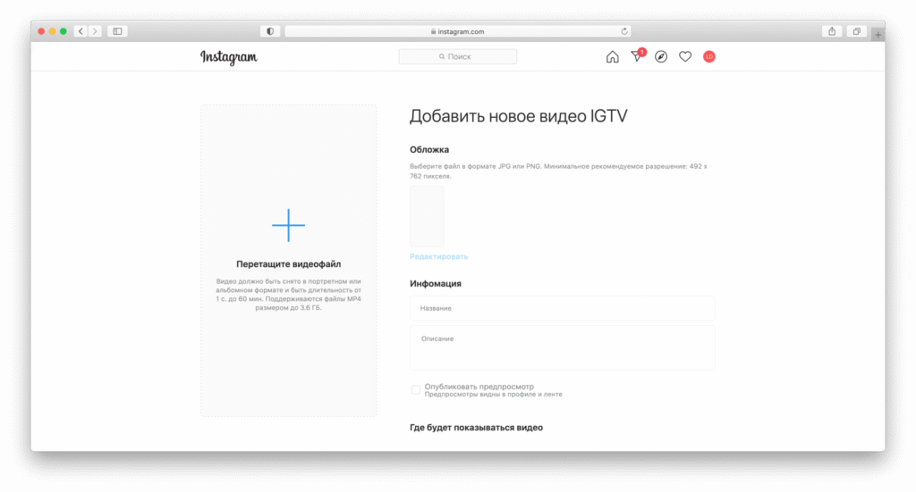 Если вы хотите загрузить видео до 60 минут, используйте веб-версию Инстаграм. Зайдите на сайт Instagram.com и перейдите в ваш профиль. Нажмите на IGTV (между вкладками с вашими публикациями и отметками). Загрузите видео. Выберите обложку и добавьте заголовок с описанием. Загрузите видео и обложку в формате JPG или PNG (минимальное разрешение 492 x 762 пикселя). Добавьте заголовок с описанием.