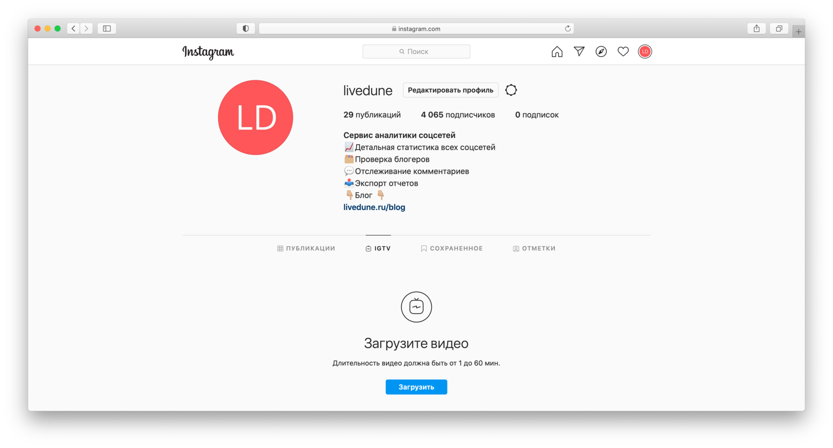 Если вы хотите загрузить видео до 60 минут, используйте веб-версию Инстаграм. Зайдите на сайт Instagram.com и перейдите в ваш профиль. Нажмите на IGTV (между вкладками с вашими публикациями и отметками). Загрузите видео. Выберите обложку и добавьте заголовок с описанием. Загрузите видео и обложку в формате JPG или PNG (минимальное разрешение 492 x 762 пикселя). Добавьте заголовок с описанием.