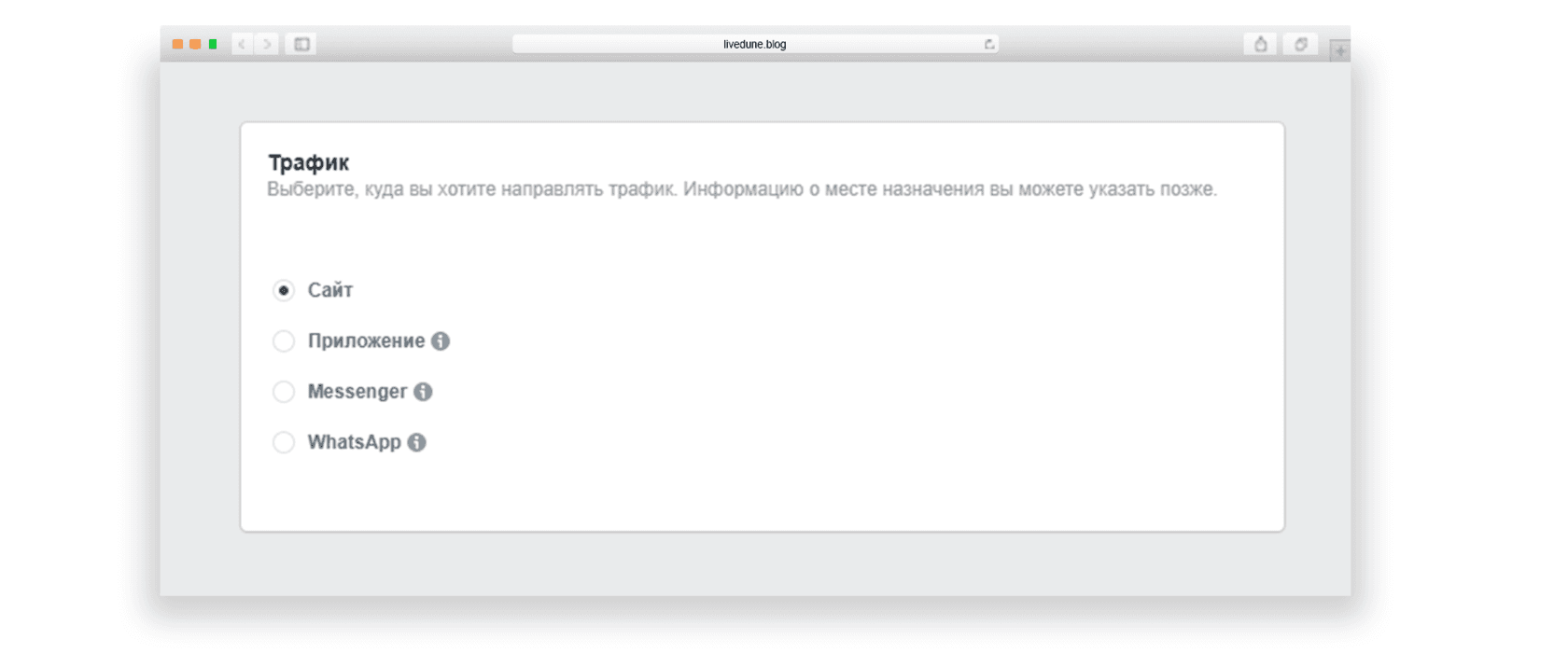 Шаг 4. Выберите куда хотите перенаправлять пользователей. В зависимости от выбранной цели могут меняться и предложенные варианты. В нашем случае для цели «Трафик» можно выбрать: