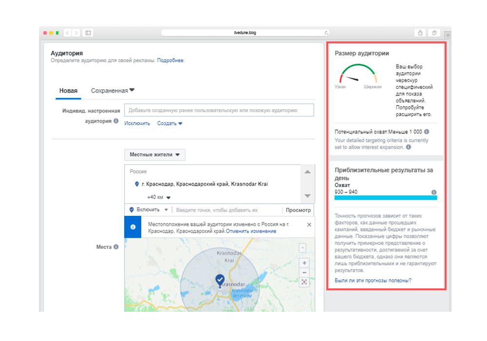 Во время настройки в правой части экрана вы можете отслеживать потенциальный охват, то есть сколько Facebook нашел людей, удовлетворяющих вашим требованиям.