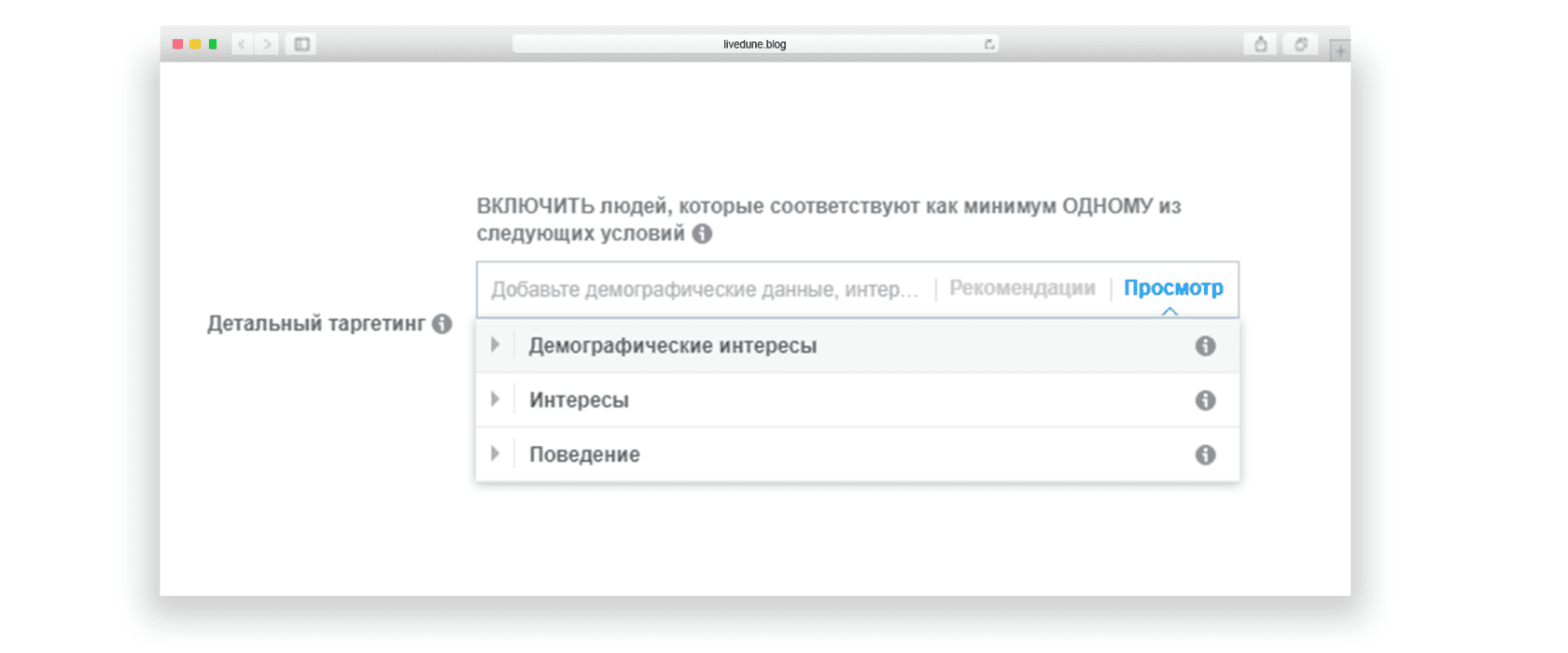 Шаг 6. Детальный таргетинг позволяет показывать рекламу на основе интересов человека и его поведения в Инстаграм, Фейсбук и за их пределами. Нажмите просмотр и выберите нужные вам интересы. Фэйсбук достаточно хорошо сегментирует интересы пользователей. Например, в Вконтакте такой сегментации нет и приходится использовать специальные сервисы — парсеры, которые позволяют собрать нужную аудиторию. При настройке аудитории в Фейсбук по интересам можно найти практически любую аудиторию, начиная от «Парикмахеров» и заканчивая сотрудниками компании, например, booking.