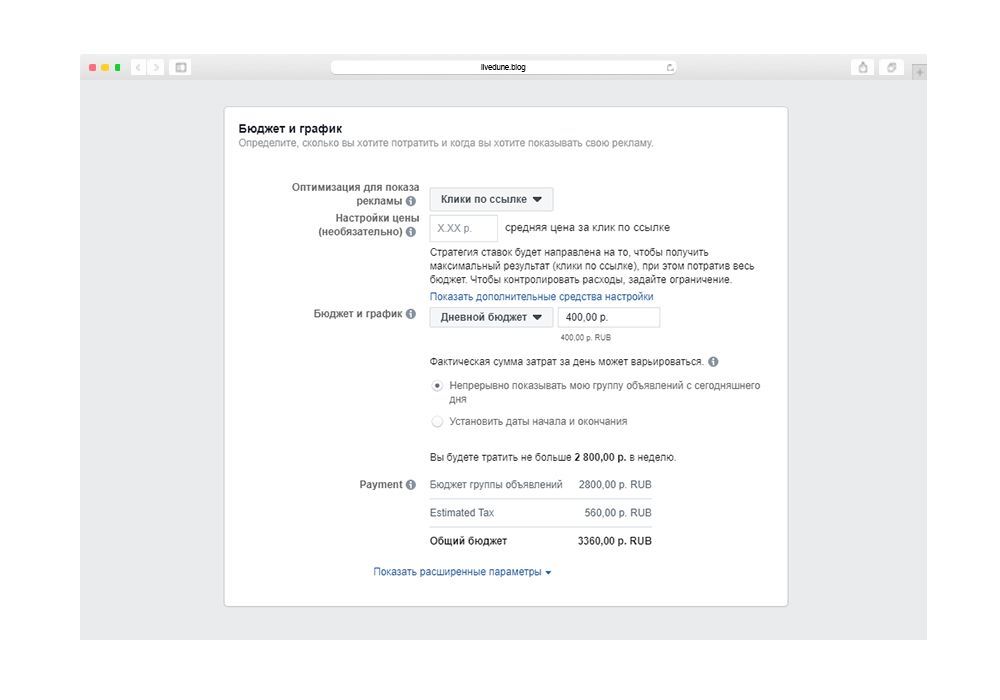 Бюджет на весь срок — сумма, которую вы потратите за весь период показа рекламы. Бюджет будет расходоваться почти одинаково каждый день. Чем больше бюджет, тем больше охвата и кликов получит реклама.