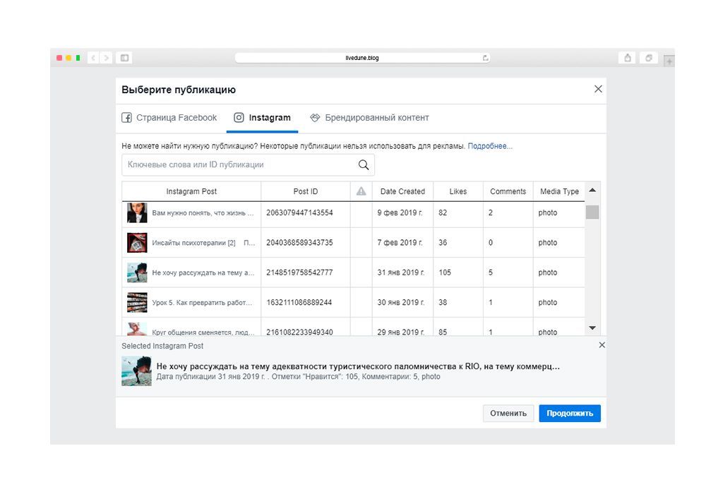 Учтите, что при запуске рекламы через приложение Инстаграм можно использовать только опубликованные посты, создать отдельное объявление для рекламы тут нельзя.