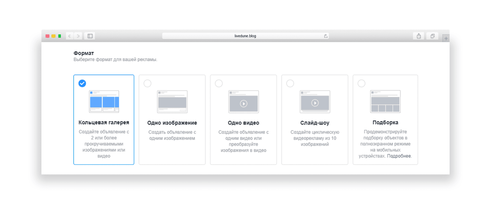 Кольцевая галерея. Дает возможность создать объявление с 2 -10 изображениями, которые можно листать. Такой формат отлично подойдет, если вы хотите ознакомить аудиторию с ассортиментом ваших товаров/услуг, создать акцент на нескольких характеристиках продукта, рассказать историю о продукте.