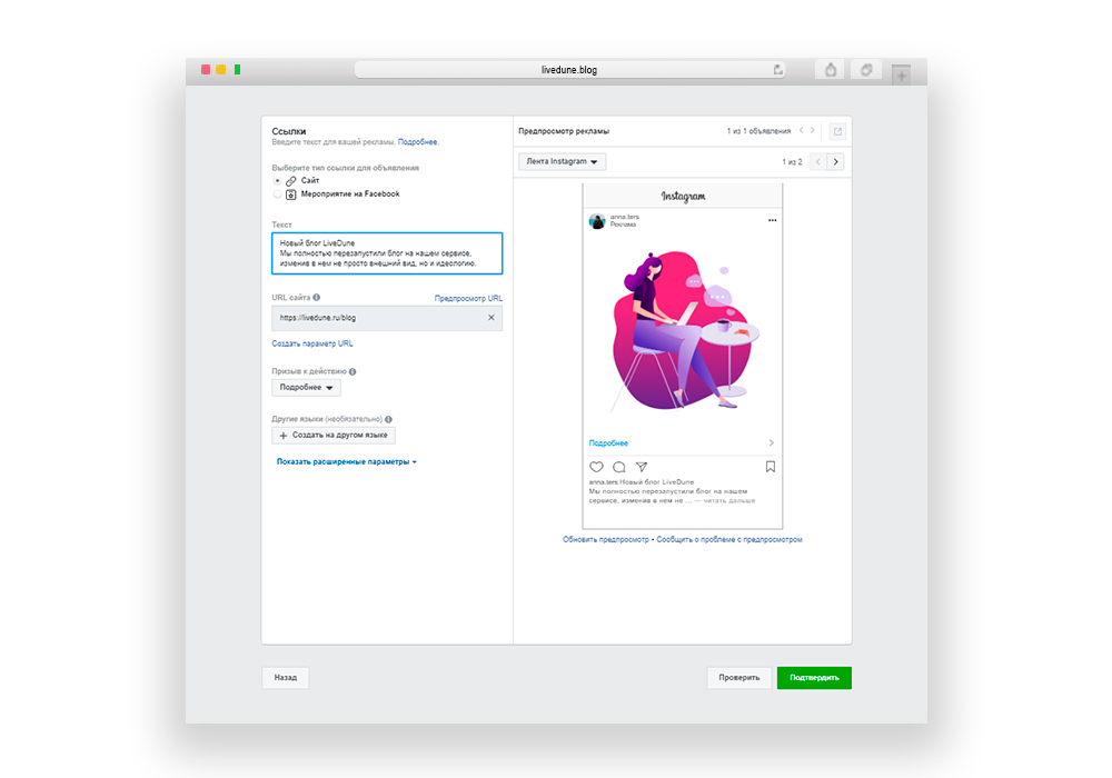 Запуск рекламы через Ads Manager в Facebook дает больше возможностей по подбору аудитории, более подробные настройки бюджета, чем в приложении Инстаграм.