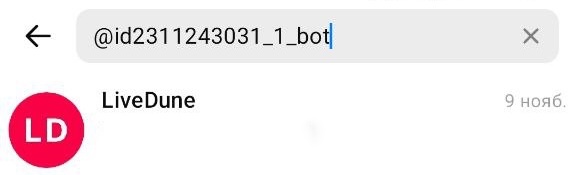 - Откройте поиск в мессендере Max и введите туда имя бота @id2311243031_1_bot (он покажет название LiveDune)