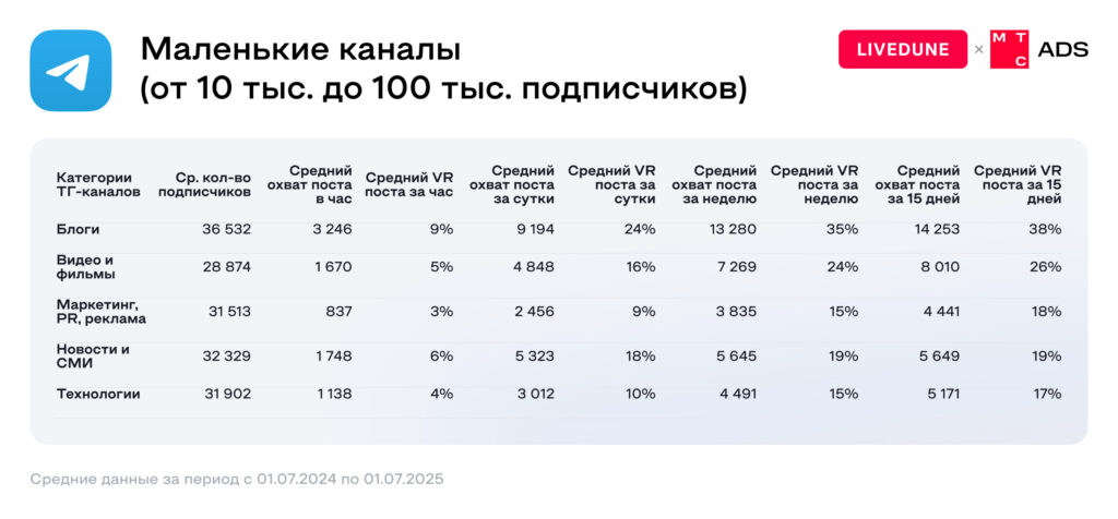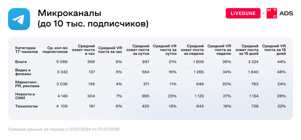 Блоги — категория с самой вовлеченной аудиторий, которая особенно эффективна в микро- и маленьких форматах от 10 до 100 тысяч подписчиков. Микроканалы в категории «блоги» показывают VR до 44% за 15 дней, а маленькие каналы сохраняют высокий уровень в среднем в 38% за тот же период. В средних каналах-блогах (от 100 тыс. до 500 тыс подписчиков) VR снижается до 36%, но абсолютный охват достигает 74 тыс. человек. Большие каналы инфлюенсеров за две недели демонстрируют VR на уровне 37% и максимальный охват в среднем на уровне 344 тыс. уникальных просмотров на пост, по данным статистики сервиса LiveDune.