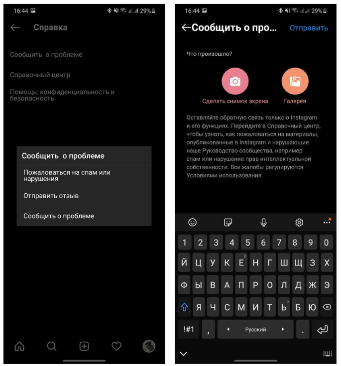 Откройте свой аккаунт в приложении Инстаграм* и нажмите на меню (три полоски в правом верхнем углу) — «Настройки» — «Справка» — «Сообщить о проблеме» — «Сообщить о проблеме». Детально опишите ваш вопрос в свободной форме на русском языке. При необходимости сделайте скриншот экрана (например, если столкнулись с ошибкой) или загрузите файлы из галереи смартфона.