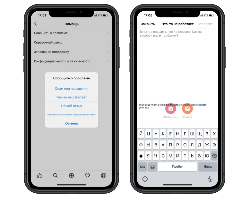 Откройте свой аккаунт в приложении Instagram и нажмите на меню (три полоски в правом верхнем углу) — «Настройки» — «Помощь» — «Сообщить о проблеме» — «Что-то не работает». Чтобы получить ответ, детально, но без лишней воды, опишите свою проблему в свободной форме на русском языке. При необходимости сделайте скриншот экрана (например, если столкнулись с ошибкой) или загрузите файлы с галереи смартфона. Также для пользователей iPhone есть возможность отдельно пожаловаться на плохое качество контента. Актуально, когда социальная сеть сильно сжимает и портит качество снимка или видеоролика.