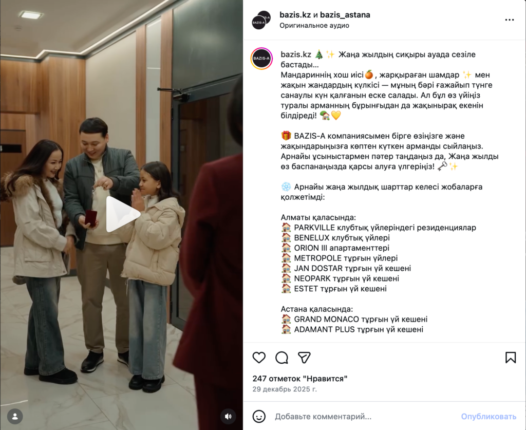 - Instagram құрылыс компаниялары үшін негізгі визуалды платформа болып қала береді. Мұнда олар нысандарды, интерьерлерді және локацияларды көрсетіп, жылжымайтын мүлікті таңдау кезеңінің бастапқы сатысында әлеуеті мол сатып алушыларға алғашқы әсер қалыптастырады. Ұзақ келісім-шарт жасасу циклі жағдайында дәл осы танымалдылық болашақ сенімнің негізін қалайды.*