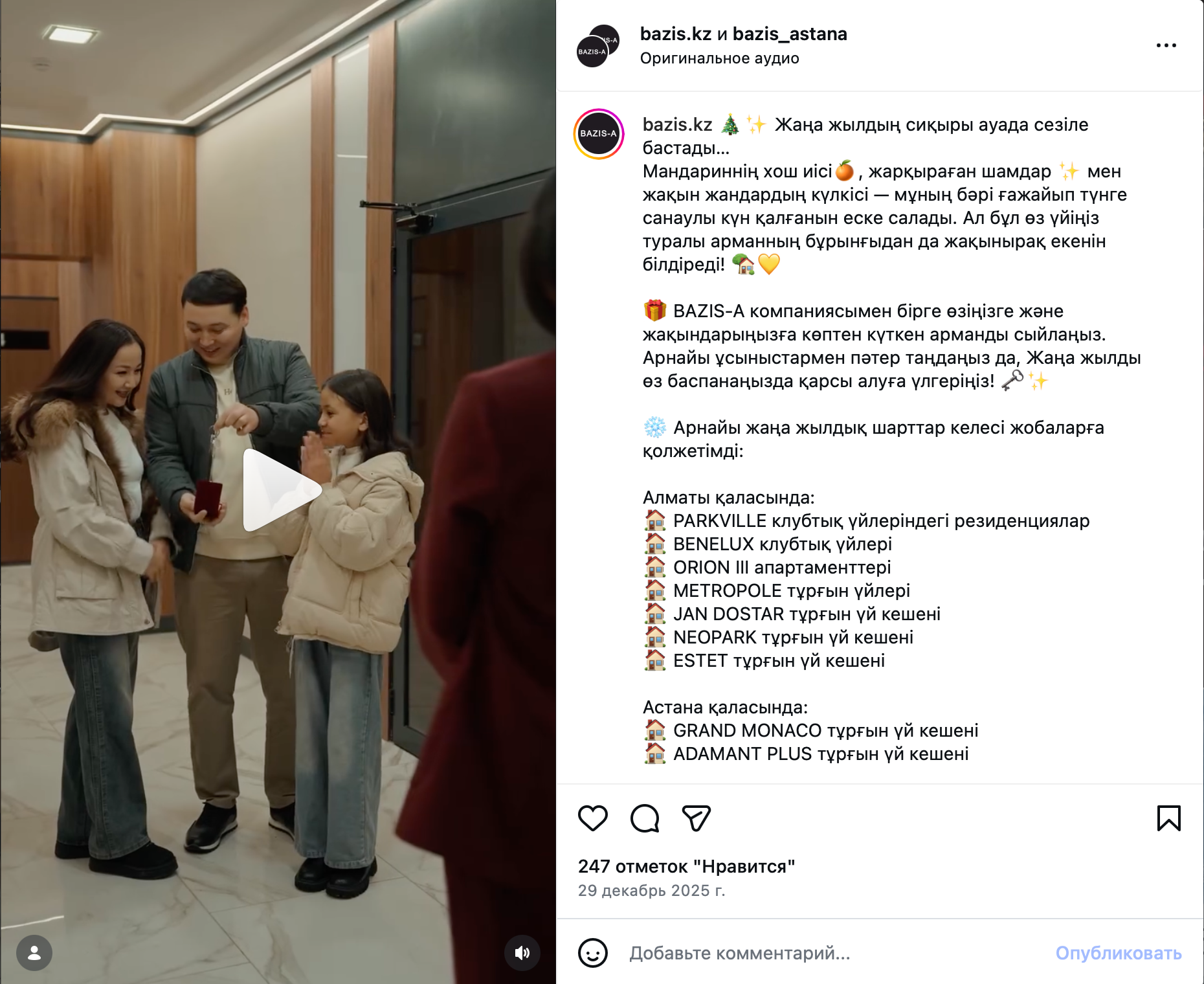На пятом месте по числу подписчиков – строительная компания BAZIS-A. На ее долю приходится около 5% аудитории в Инстаграм* с 195 532 подписчиками, что почти в два раза меньше, чем у топ-4. Компания известна на рынке уже более 35 лет и занимает второе место в рейтинге застройщиков Казахстана.