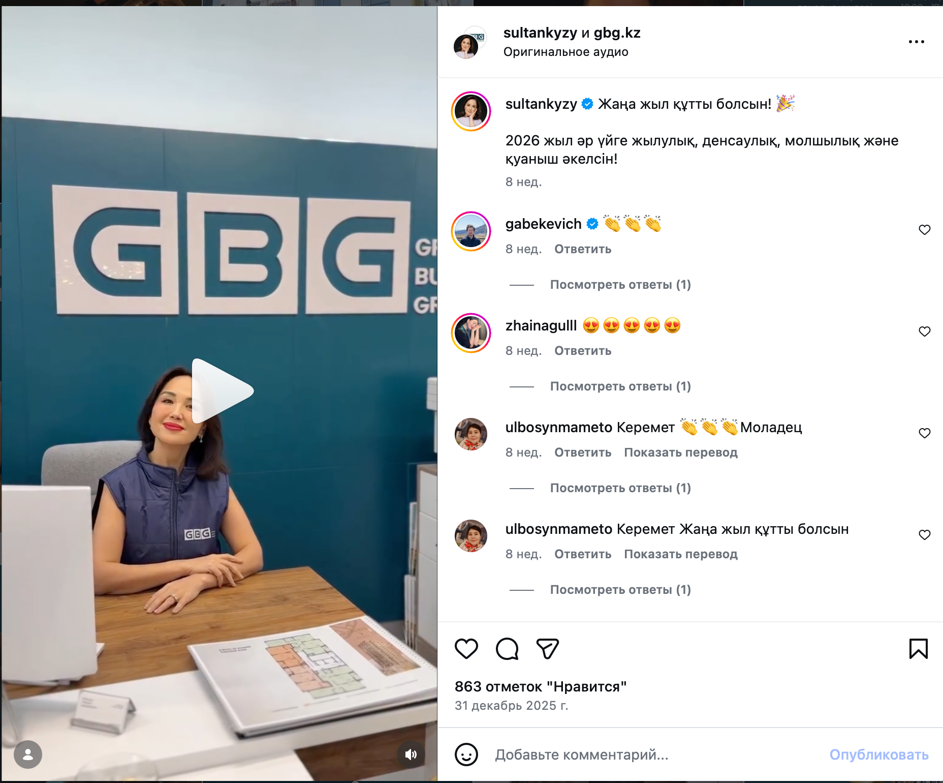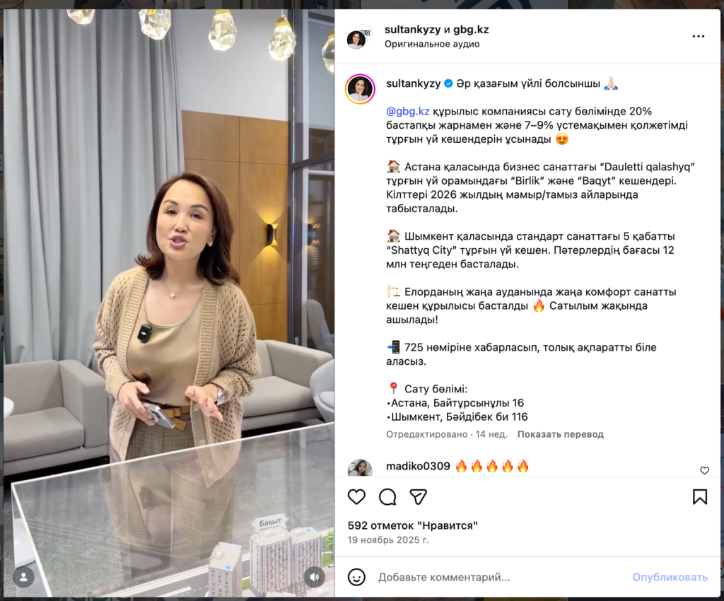 Так, GBG активно сотрудничает с медийными персонами. Один из примеров такого партнерского формата продвижения – совместный контент с Ляйля Султанкызы. Подобные публикации позволяют не просто привлечь новую аудиторию, но и сформировать живой диалог с клиентами. Благодаря этому сложные темы становятся более понятными, что приближает бренд к аудитории.