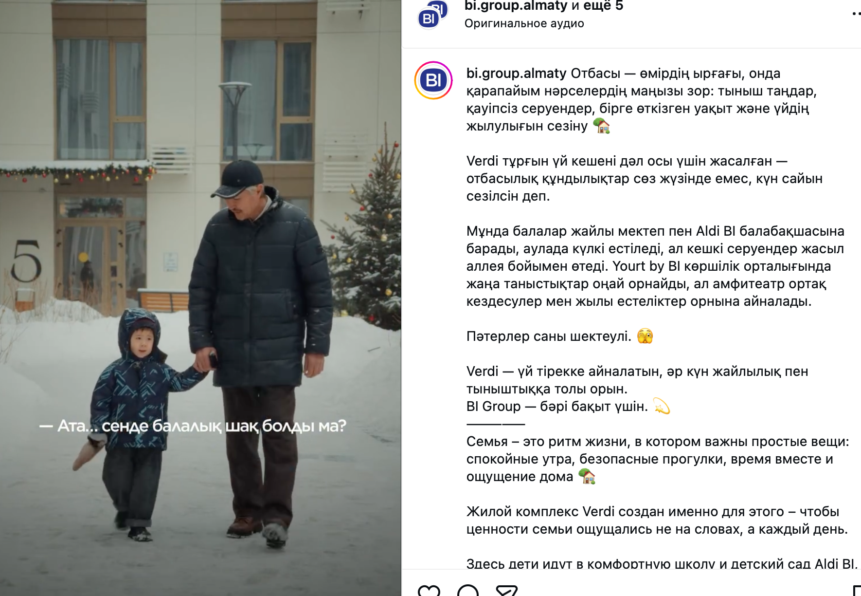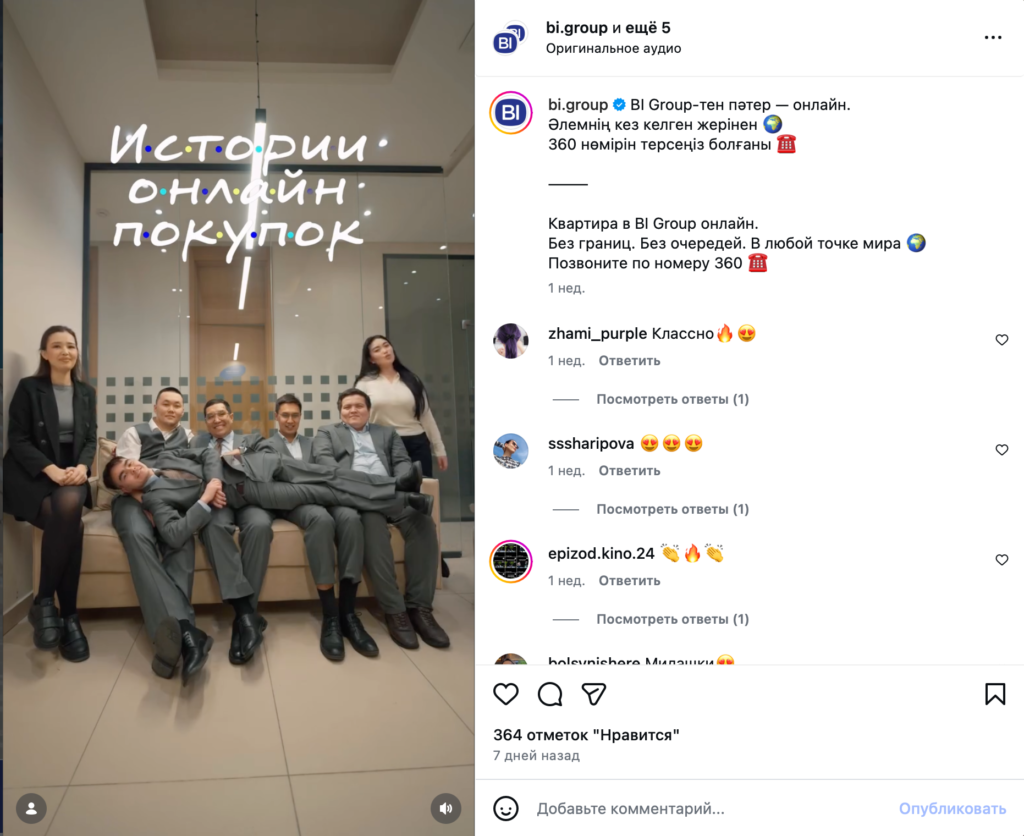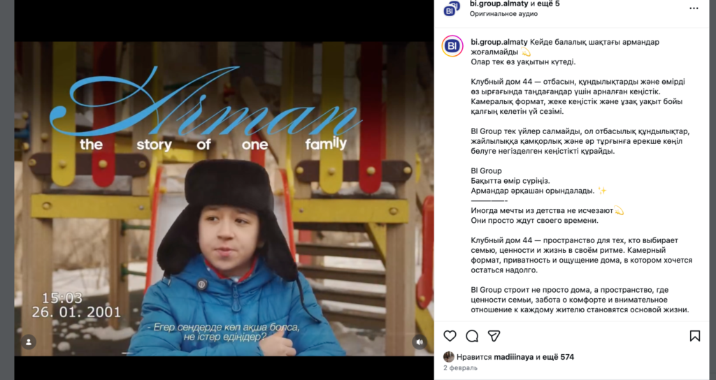 BI Group отбасылық құндылықтар мен тұрғындардың күнделікті өмірі төңірегіндегі контентті жүйелі түрде дамытып келеді. Қызметкерлер мен клиенттердің көмегімен жасалған контент — брендтің «бақыт мекені» идеясы арқылы көрсетілетін ұстанымын қолдайды.