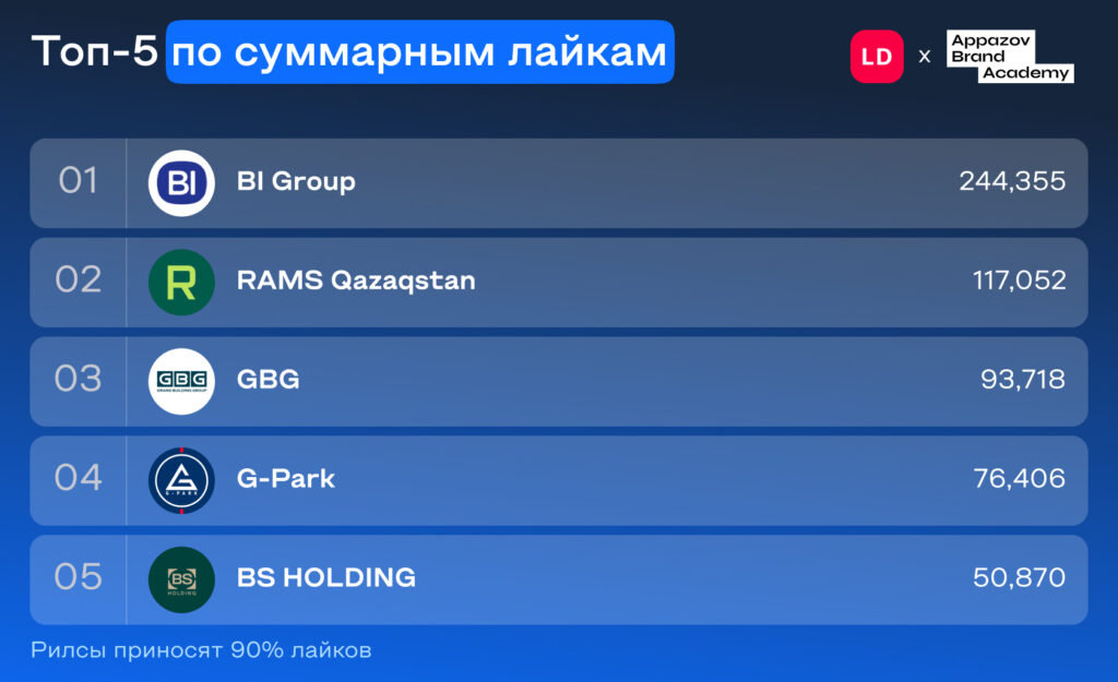 Жиналған лүпіл саны бойынша абсолютті көшбасшы – бәріне танымал BI Group компаниясы. Ол жобалар саны бойынша да құрылыс компаниялары рейтингінде бірінші орында тұр. Таңдалған іріктеме бойынша барлық лүпілдердің төрттен бірінен астамы дәл осы брендке тиесілі. Зерттелген кезеңде компания 412 пост жариялаған, оның 381-і –рилс, яғни контенттің 92%-ын құрайды. Дәл осы формат аккаунтқа лүпілдердің басым бөлігін әкелген: рилстардағы лүпіл саны суреттер мен карусельдерге қарағанда шамамен 20 есе көп.