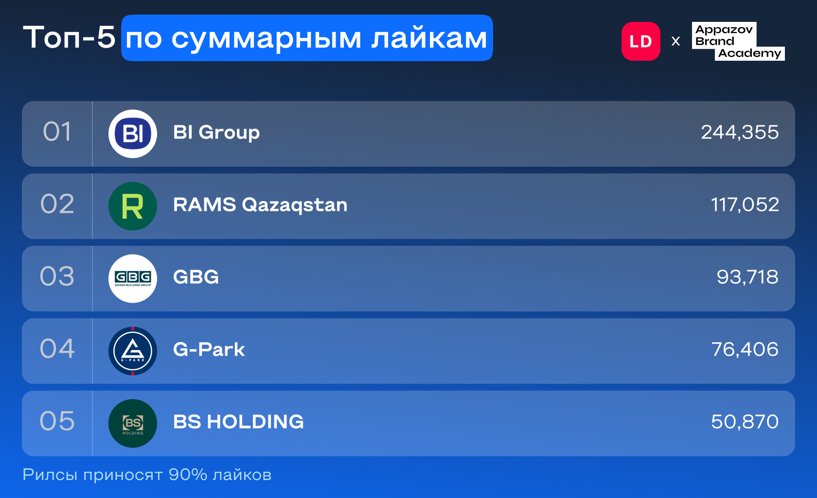 В два раза меньше лайков (117052) собрала компания RAMS Qazaqstan. Постов также было опубликовано меньше в два раза (189), а вот соотношение форматов примерно одинаковое: почти 95% публикаций в аккаунте компании – это рилсы. Они же принесли бренду и 95% лайков. Помимо этого, стоит отметить, что подписчиков у компании в 4 раз меньше, чем у лидера рейтинга (110607 у RAMS и 464384 у BI Group).