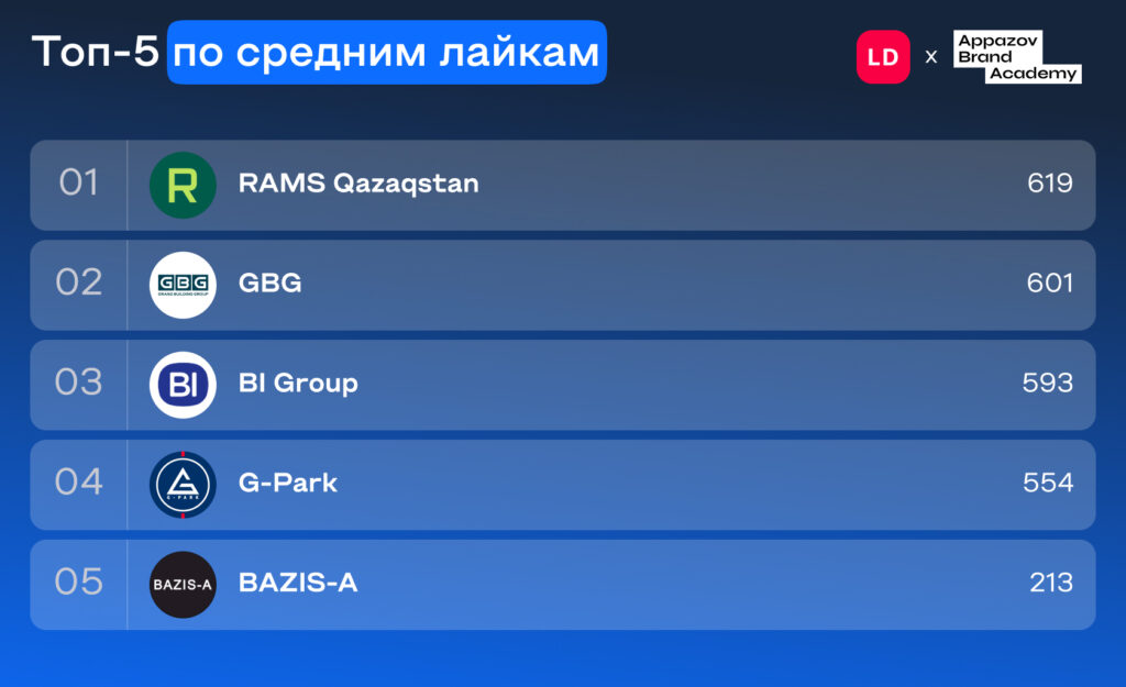 - Лидерство у BI Group забирает серебряный призер прошлого рейтинга RAMS Qazaqstan. Компания получила в среднем больше лайков (619 против 593), сделав в два раза меньше публикаций и имея в четыре раза меньше подписчиков. Это показывает высокую вовлеченность аудитории.