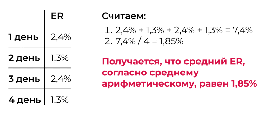 Сумму значений нужно поделить на их количество. Например, вы хотите узнать средний ER за 4 дня при нормальном распределении значений и без аномальных выбросов. Для этого считаем среднее арифметическое: складываем ER всех дней и делим полученное число на количество дней.