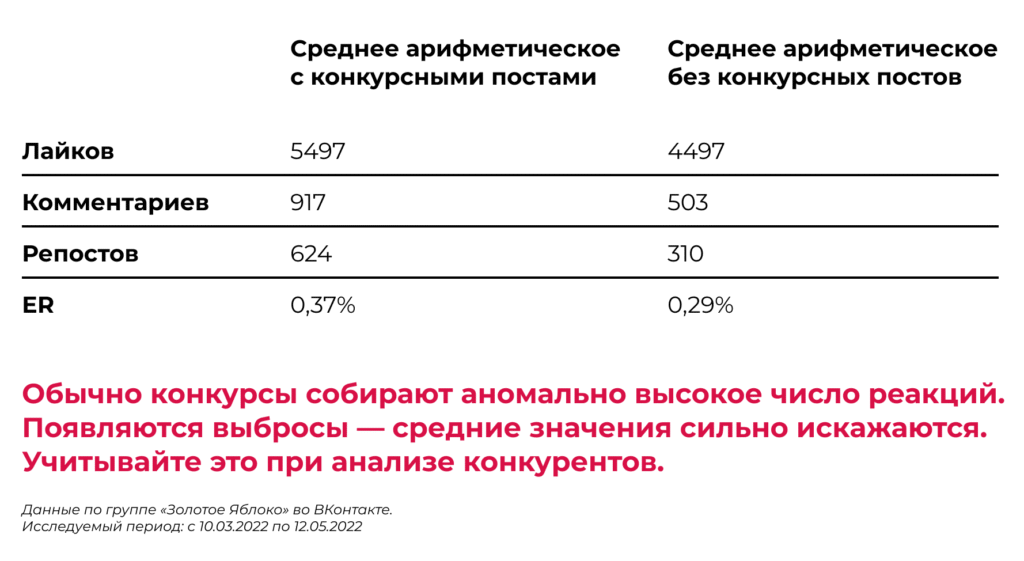 Например, в группе «Золотое Яблоко» во ВКонтакте иногда публикуют конкурсные посты. Они набирают более высокие показатели вовлеченности чем обычные публикации. Если посчитать средний ER с учетом конкурсов, мы получим 0,37%, а без учета конкурсов — только 0,29%. Аналогичная ситуация с числом комментариев. С конкурсами в среднем получаем 917 комментариев, а без конкурсов — всего лишь 503. Очевидно, что из-за розыгрышей средние показатели вовлеченности завышаются. В этом случае конкурсные посты следует исключить из анализа, чтобы объективно оценить эффективность контента в группе.
