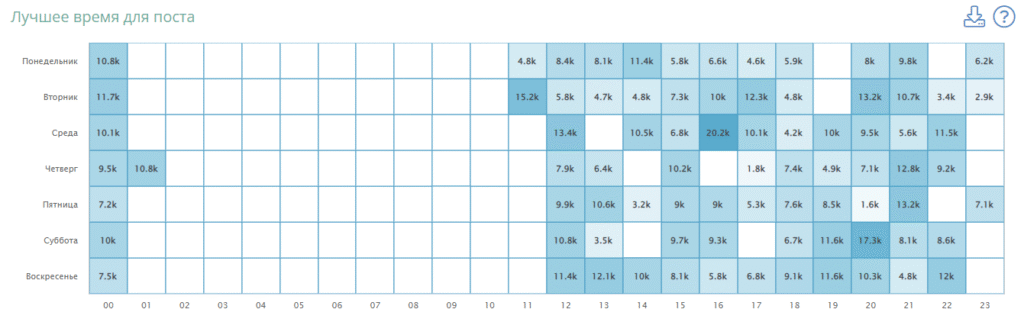 Еще пример. Нужно узнать, в какое время аудитория чаще всего взаимодействует с публикациями. Для этого можно посчитать данные вручную или использовать готовую таблицу из LiveDune (вкладка «Вовлеченность» ― таблица «Лучшее время для поста»). По ее данным ― больше всего реакций пользователи оставляют в среду в 16 часов. Это время и есть мода. Таким образом, если вам нужно найти самое популярное значение, а не классическое среднее — проще использовать моду.