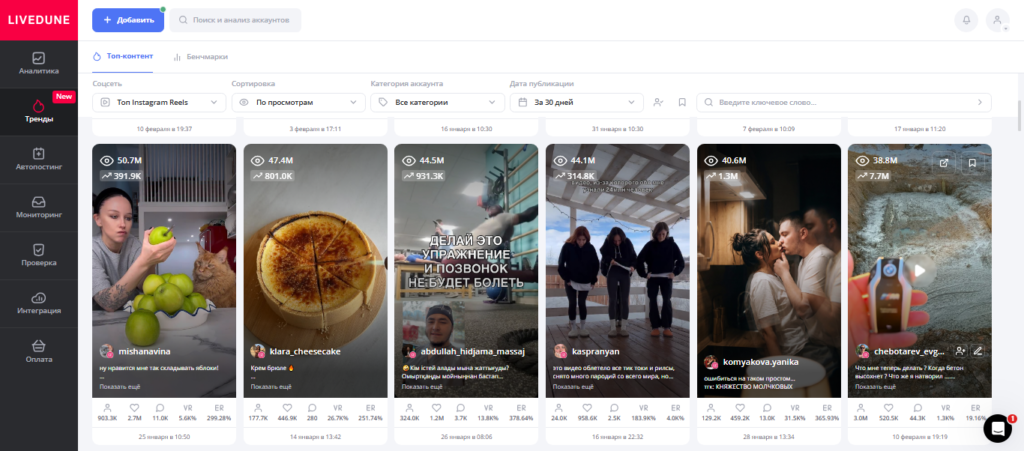 Если аккаунт не является приватным, вы можете скачать любой доступный пост: одиночное изображение, карусель, IGTV и даже Reels. А посмотреть топовые рилсы, а также шортсы и клипы из других соцсетей, можно при помощи модуля Тренды от LiveDune.