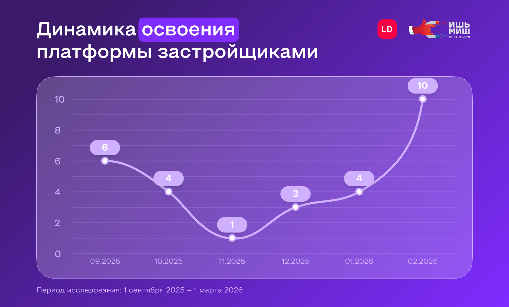 Наименьшее количество девелоперов появилось на платформе в ноябре 2025 года — один. А уже в феврале наблюдалась пиковая активность: сразу 10 застройщиков опубликовали свои первые посты.