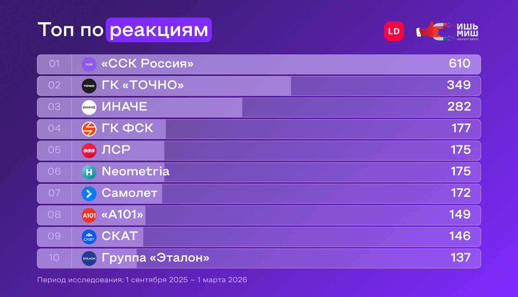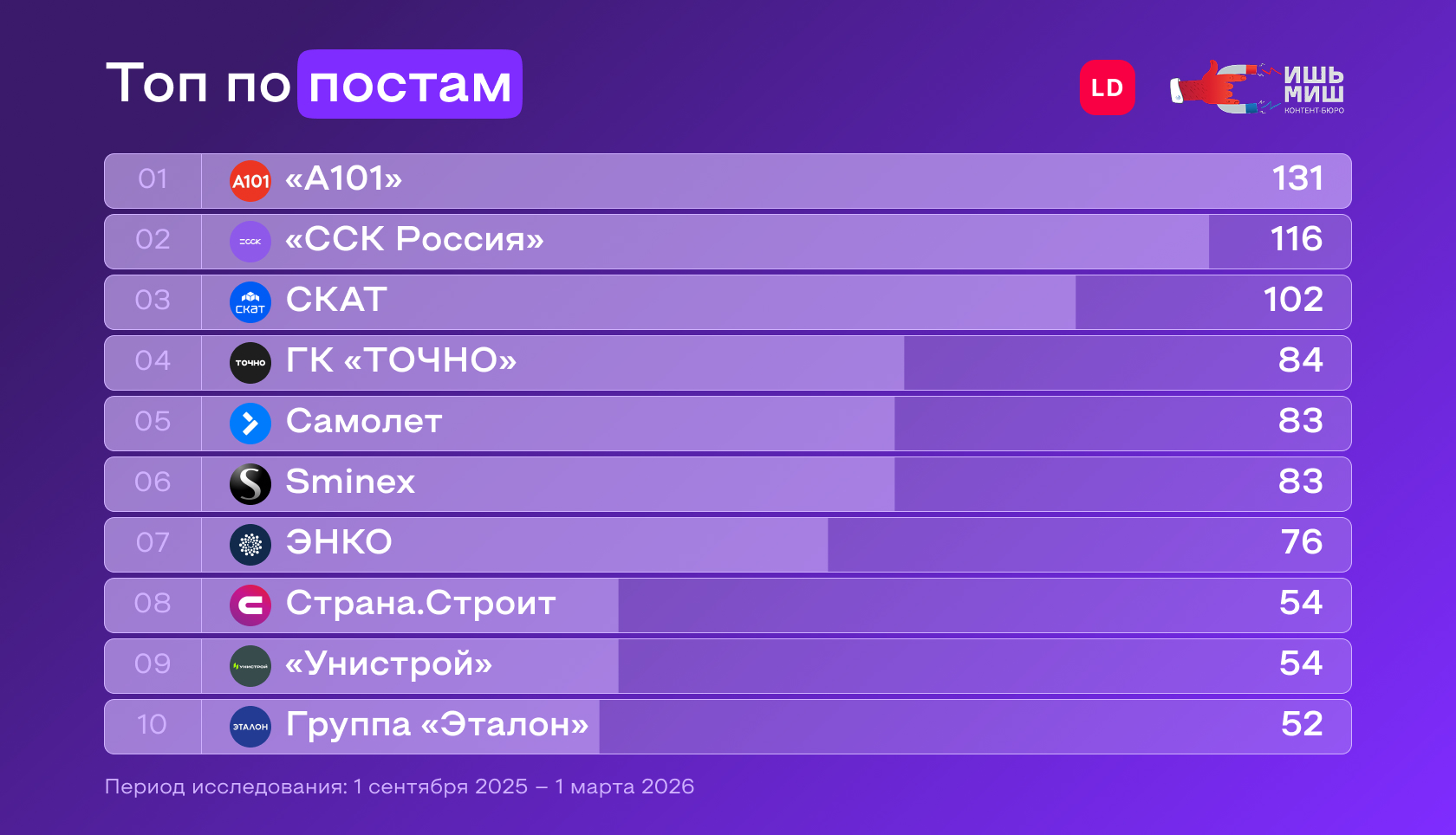 | Контент-бюро «Ишь, Миш!»— берут на себя ответственность за социальные сети как за ключевое лицо бренда: системно работают на долгосрочной дистанции, глубоко погружаются в продукт и сопровождают коммуникацию с аудиторией годами. Помогают девелоперам стать любимым брендом, который будут советовать родным и близким. Занимают первое место в Рейтинге Рунета в категории «SMM и контент-агентства в сфере недвижимости». Регулярно проводят совместные исследования с LiveDune: — Как крупнейшие застройщики России продвигаются во ВКонтакте (2023) — Что работало в SMM застройщиков (2024) — Продвижение крупнейших застройщиков во ВКонтакте (2024) — Продвижение телеграм-каналов крупнейших застройщиков (2024) — Какие типы контента собирают больше лайков в соцсетях застройщиков (2025) |