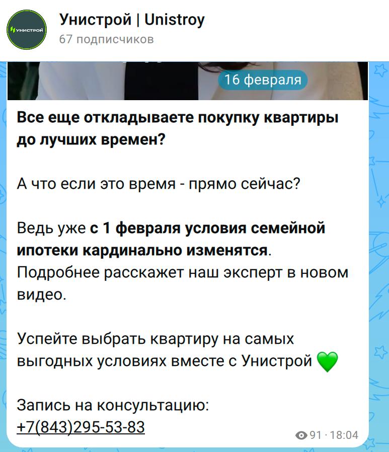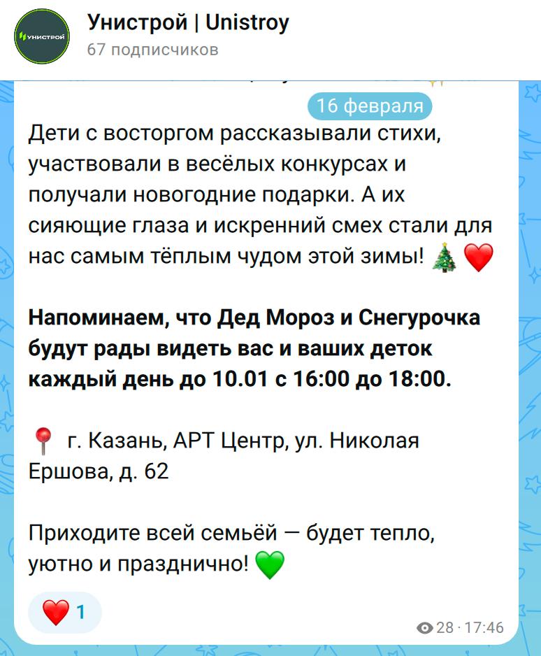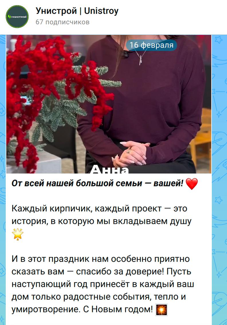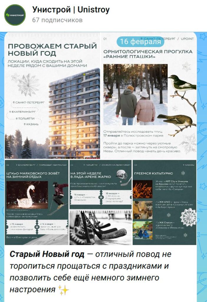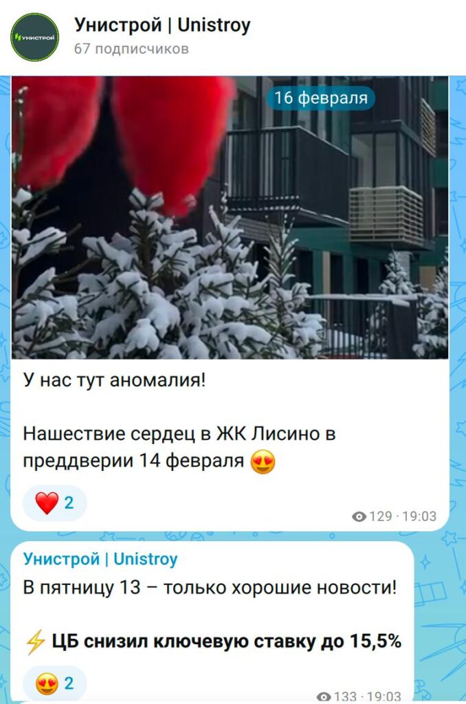 Яркий пример — антикейс «Унистрой». Компания завела свой канал еще в декабре, но активный постинг начала только 16 февраля. В этот день они выложили объем трехмесячного контента — более 40 постов сразу.