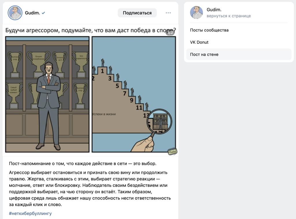 ВКонтакте много лет воспринималась как соцсеть для мемчиков, поэтому начнем с них. В авторских мемах яркий пример — паблик художника Gudim. Собственные узнаваемые рисунки, а не просто скачанные картинки, дают ему хороший охват. Например, пост против кибербуллинга собрал более 4 млн просмотров при том, что подписчиков у Gudim 319 тысяч.