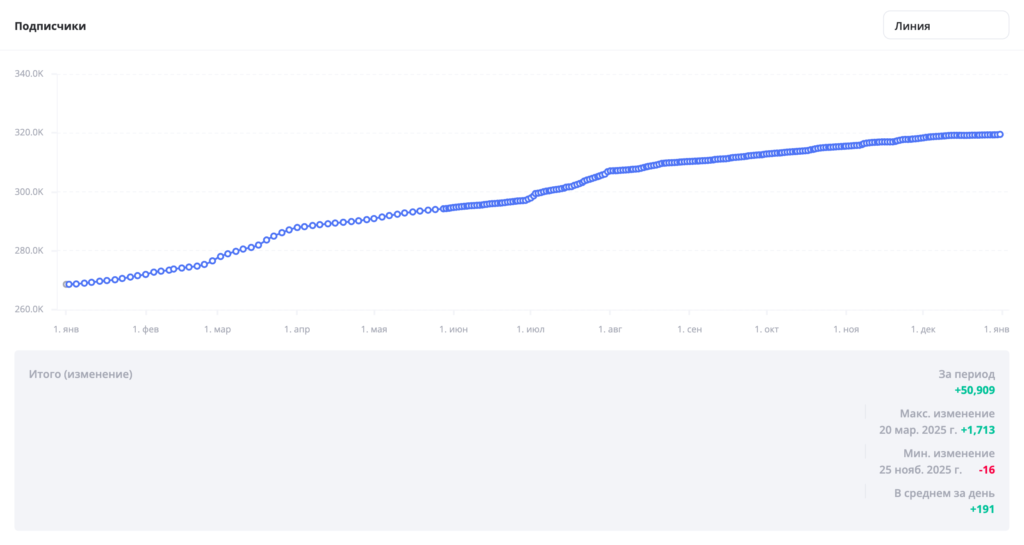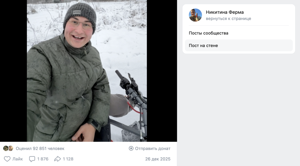 Здесь возьмем пример роста года по версии самого ВКонтакте. Аккаунт «Никитина ферма» за 2025 год набрал миллионную аудиторию практически с нуля. Прирост подписчиков составил 1,1 млн.