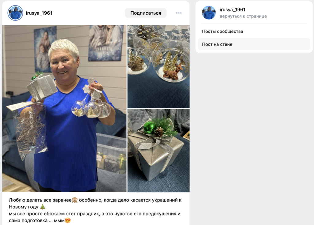 Еще одно доказательство, что простота и «жизненность» в трендах — аккаунт бабушки шести внуков irusya_1961 (69 тыс. подписчиков). По нашим наблюдениям — один из самых виральных аккаунтов. В среднем за 2025 год VR составил 71%, что очень много.