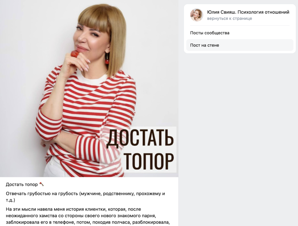 Кажется, что посты с большим количеством текста — вообще не формат ВКонтакте. Но у нас есть пример, показывающий, что это не так. В блоге психолога Юлии Свияш длинные авторские тексты набирают хороший виральный охват. Например, пост, почему не стоит отвечать грубостью на грубость, по формату более похожий на ЖЖ, собрал почти 300 тыс. просмотров при 50 тыс. подписчиков.