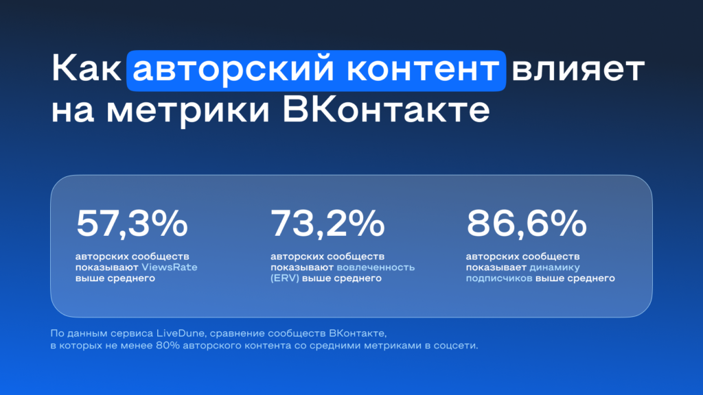 86,6% сообществ с авторским контентом показали больший рост подписчиков, чем в среднем по соцсети.