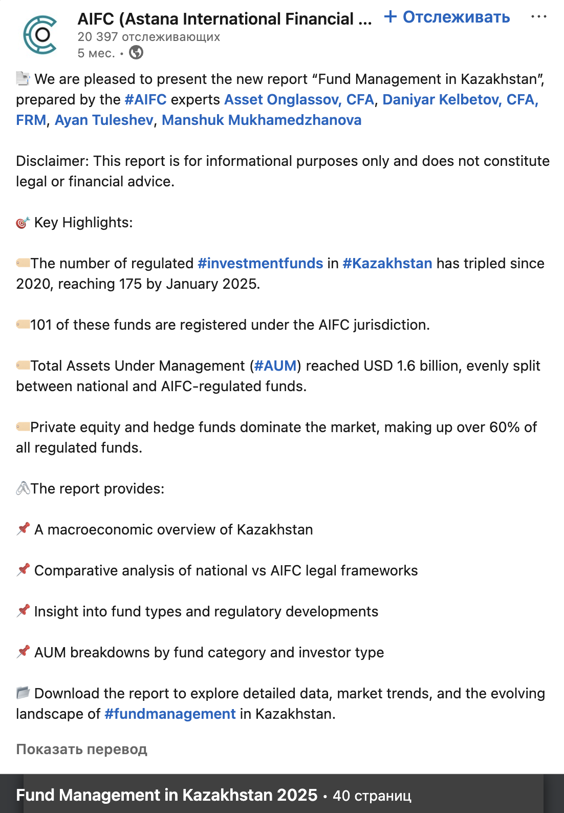 Такой контент просто не совпадает с задачами центра. Подписчики МФЦА: профессионалы, представители компаний, инвесторы, и легкий развлекательный контент для широкой аудитории им неинтересен. Им важны польза, экспертность и прикладные инсайты.
