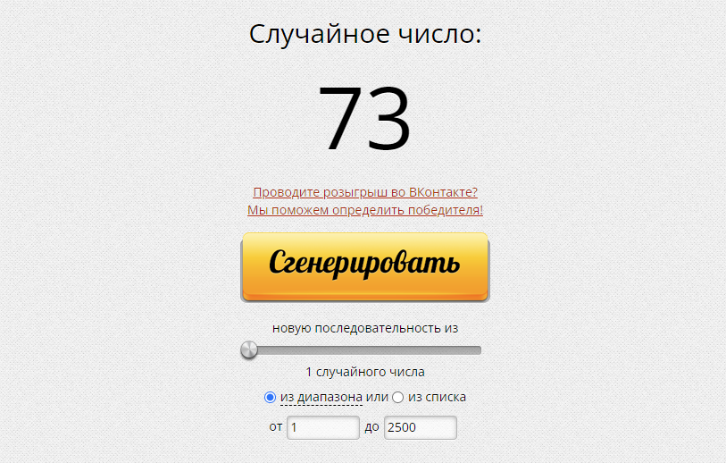 Далее включите запись экрана или организуйте прямой эфир. В рандомайзера чисел введите диапазон чисел ― количество участников розыгрыша, в данном случае, количество выгруженных комментариев. Например, если выгрузили 2500 комментариев, укажите диапазон от 1 до 2500. Нажмите на кнопку «Сгенерировать».