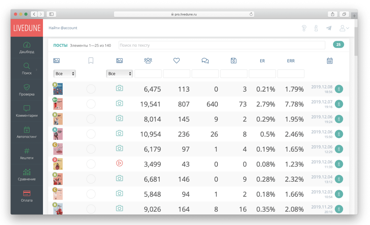 Оценка постов поможет проанализировать качество контента относительно скорости набора лайков и оценить такие параметры поста, как охват, реакции (количество лайков, комментариев и сохранений), ER и ERR, увидеть, с каким форматом (видео, фото) лучше взаимодействуют пользователи.
